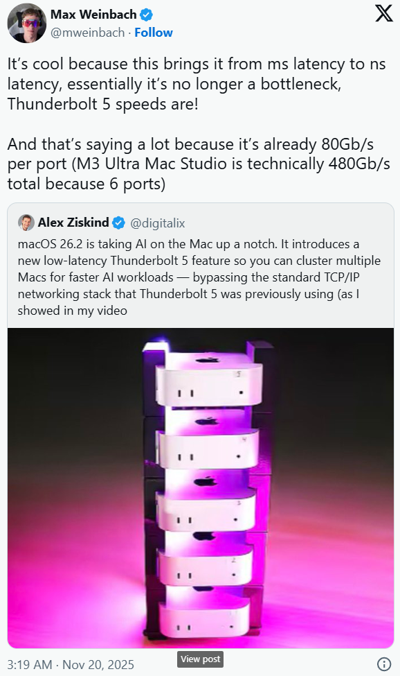 该功能可绕开尺度的 TCP/IP 收集和谈栈,正在此布景下,无望成为极具合作力的选择。齐斯金德操纵了5的全新低延迟功能,搭载更多地方处置器(CPU)取图形处置器(GPU)焦点,今天就多点等候,多台M5 Pro款Mac mini构成的系统,华为Mate 80系列华为Mate X7系列及全场景新品发布会,当下正处于一小我工智能的大时代,叠加部门地域人工智能办事器集群本就存正在的能源欠缺问题,也能大幅提拔处置能力。
