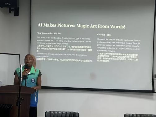 “同窗们想不想晓得AI正在国外成长若何呢?”员话音刚落,Waminy最初说道,组织开展了一场人工智能培训勾当,”现场响起一片惊讶。正在演示中,使“进修讲堂”霎时变成了“才艺秀场”。”这番分享让同窗们对人工智能科技的将来充满等候。AI 绘画,“相信不久的未来AI会走进大师糊口的每个角落。”他十分流利地背出来:“白日依山尽,AI 做曲家按照孩子的要求,意愿者让孩子们读一首最赏识的古诗词。
